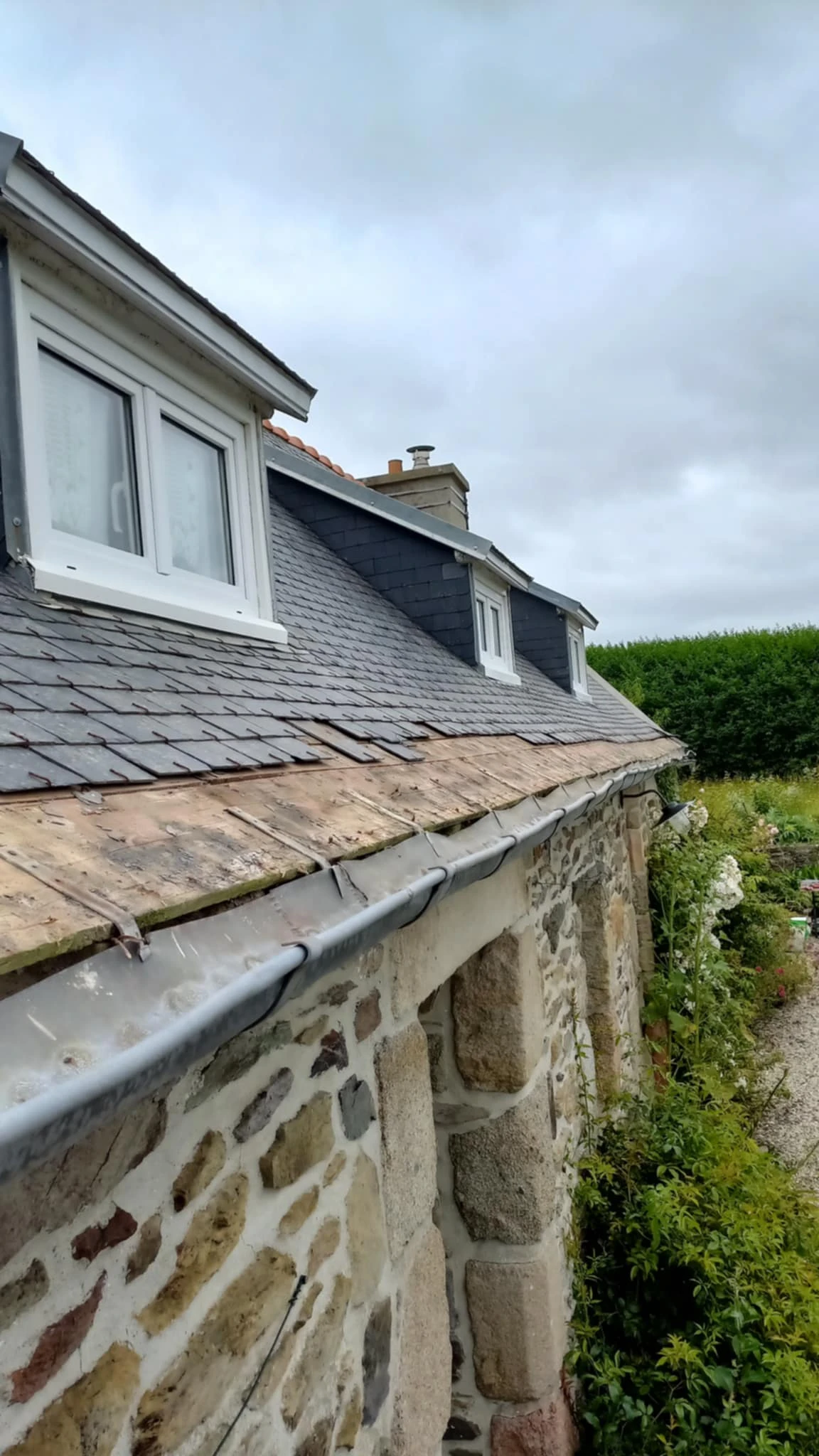 Lors de cette intervention à Lanvollon, KBCouverture a également remplacé les anciennes gouttières par des modèles en zinc, un matériau à la fois solide, esthétique et recyclable. Ces nouvelles gouttières assurent une évacuation optimale des eaux pluviales, tout en s’intégrant parfaitement au style de l’habitation.